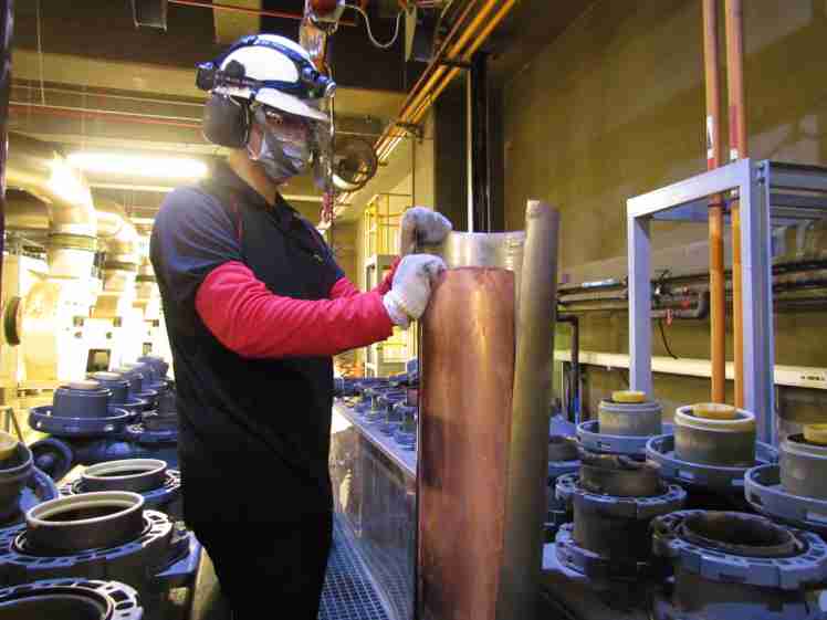 尊时凯龙将废弃物转化成有效的工业或民生原物料,,图为废铜液淬炼后再制成纯度极高的铜管