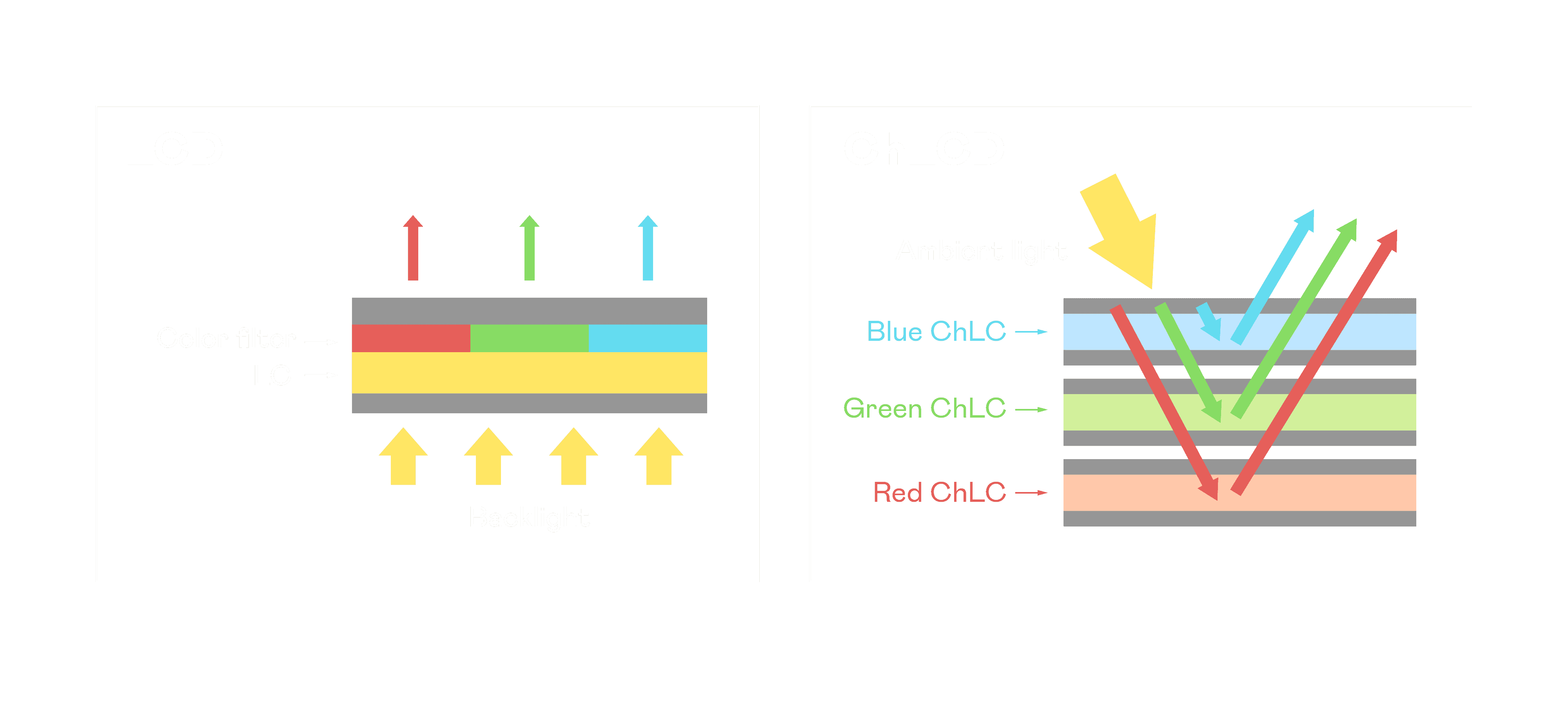 ChLCD 胆固醇液晶就如同纸张一样,,,,透过反射环境光来显示影像,,因此长时间观看不易造成人眼视觉疲劳,,,,可达到护眼效果。。。当处于户外阳光下使用,,,,LCD 影像容易失真而不易观看,,但胆固醇液晶仍可维持较佳的影像品质。。。